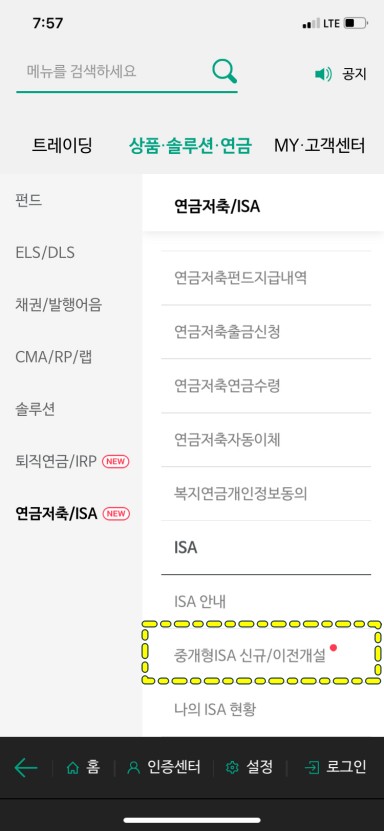 나무 기존 고객이라면, 아래와 같이 '상품・솔루션・연금' 메뉴에서 중계형ISA 신규/이전개설 메뉴를 선택하여 개설할 수 있다.