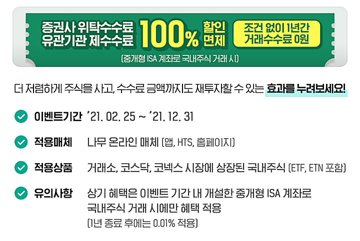 올해 초까지 증권사별로 ISA계좌 바람이 불면서, 다양한 프로모션을 했었는데 지금은 대부분 종료되고 없다. 나무도 다른 이벤트는 모두 종료되고, 주식 거래수수료 무료 이벤트만 진행중이다.