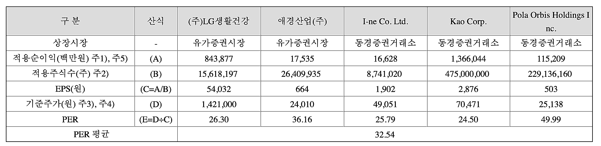 아이패밀리에스씨의 유사기업으로 선정된 회사는 LG생활건강, 애경산업, I-ne, Kao, Pola Orbis Holdings이다. 뒤에 3곳은 일본주식이다. 이들의 평균 PER은 32.54이다.