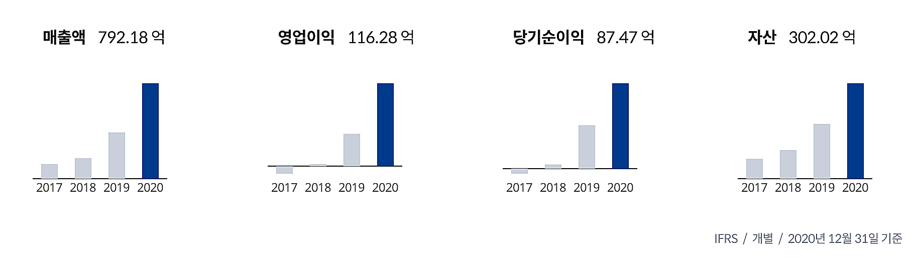 화장품 사업의 호조 때문인지 매출액, 영업이익, 당기순이익이 2020년에 큰 폭으로 상승하였다.