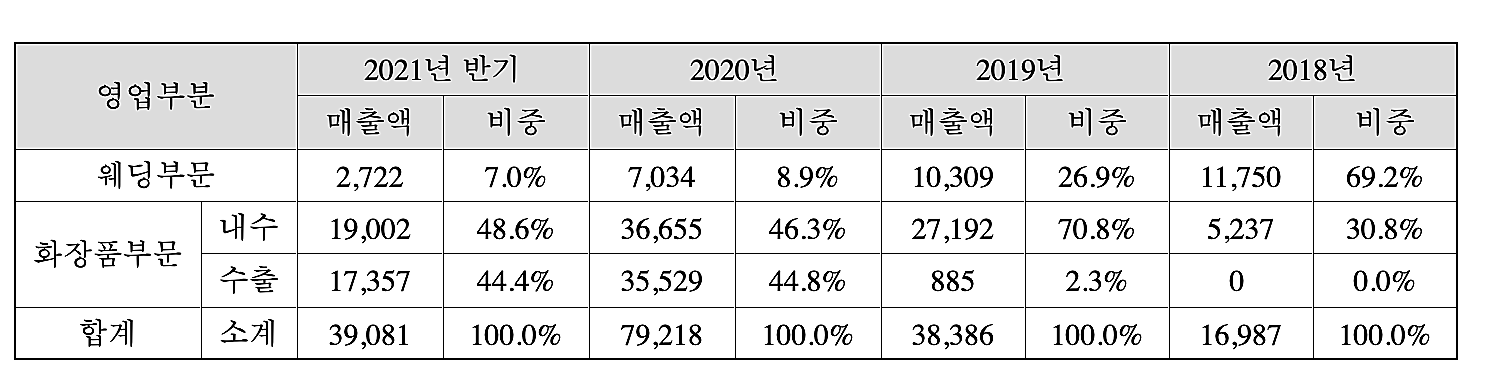 매출은 처음에는 웨딩부문의 비중이 높았으나 점차 화장품 부문의 비중이 올라가고 있다. 특히 2020년부터 수출비중이 많이 높아진 것을 확인할 수 있다. 아무래도 K-엔터의 힘을 많이 받지 않았을까 하는 생각이 든다. 수출은 유명 파트너사와 공급 계약을 통해 이루어진다고 한다.