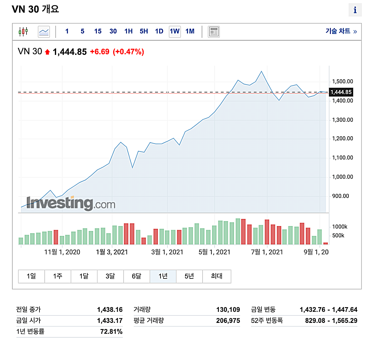 앞의 2개의 베트남 ETF 모두 VN30지수를 벤치마크 지수로 합니다. VN30은 베트남의 주식시장 대표지수로 우리나라의 코스피 200과 같은 개념으로 볼 수 있겠습니다.