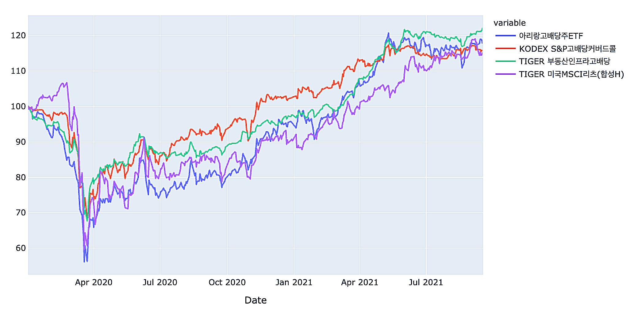 20년 1월 2일의 주가를 100으로 놓고, 이후 주가 흐름을 비교해 보았다. 대부분의 주식이 20년 4월 크게 하락한 이후에 계속해서 상승하는 모습을 보여주고 있다. 특히 TIGER 부동산 인프라 고배당 ETF가 많이 상승하였는데, 경기회복에 대한 기대감이 반영되지 않았나 싶다.