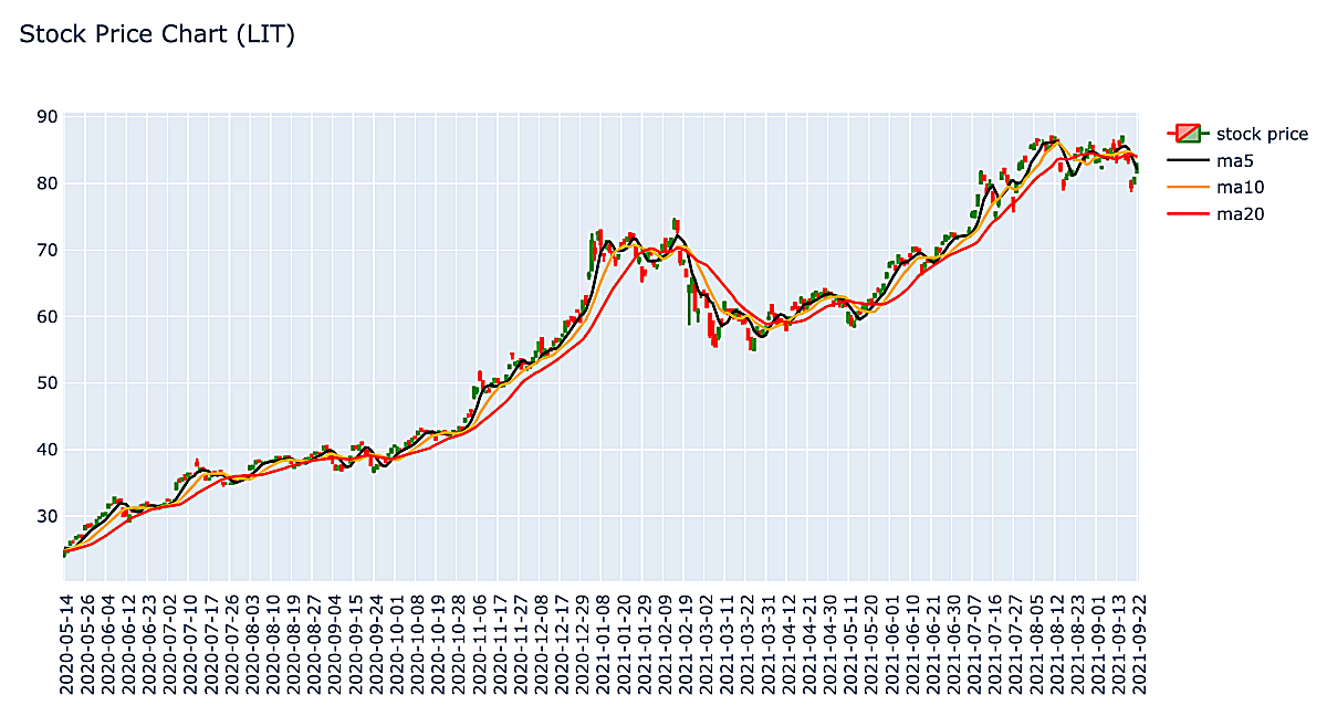 LIT ETF의 최근 가격추이를 살펴보면 아래와 같다. 1년 전에만 매수했어도, 쏠쏠한 수익을 볼 수 있었는데 아쉽다. 최근에는 다시 조정을 받고 있는 모습니다.