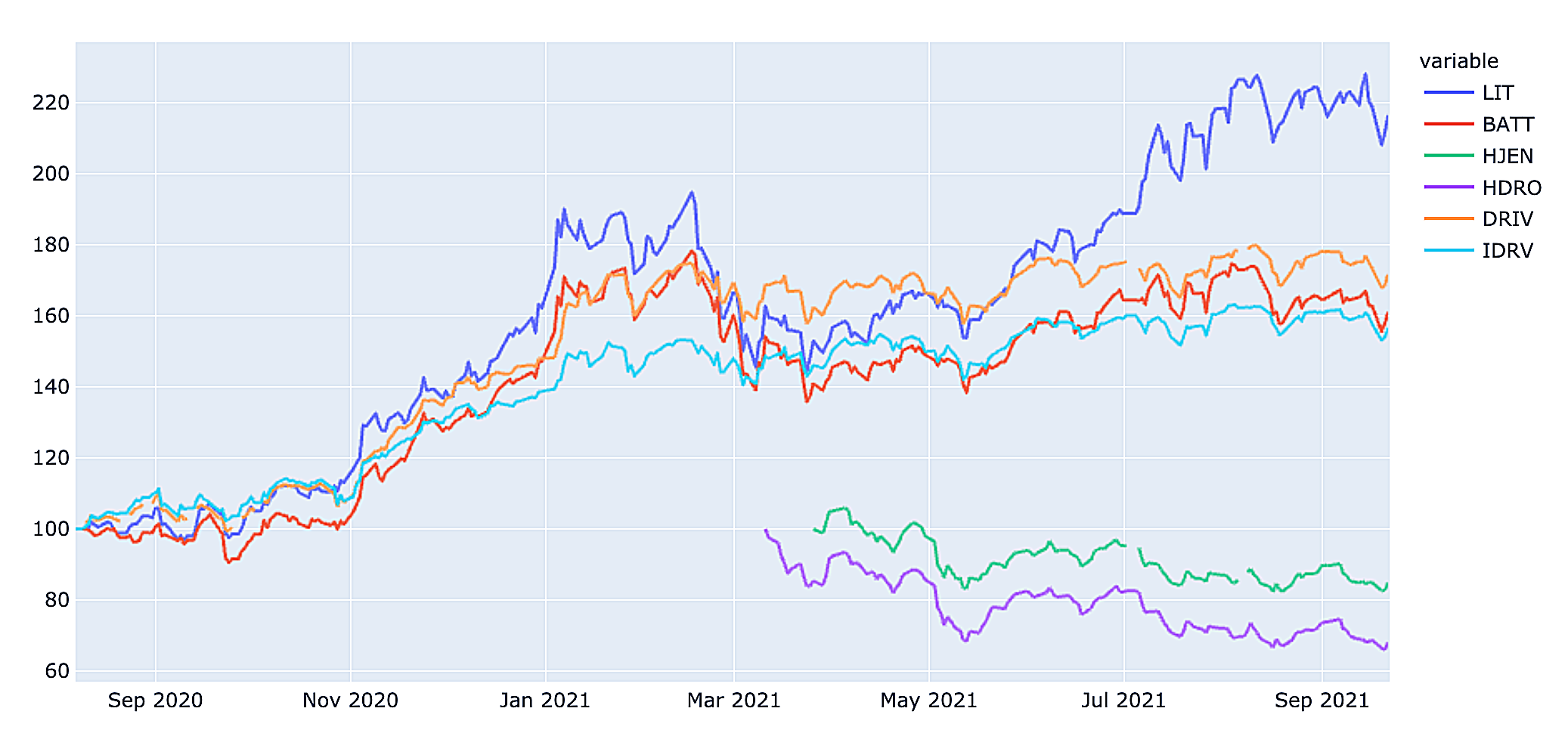 다른 전기차 ETF로 BATT, HJEN, HDRO, DRIV, IDRV가 있다. 이 ETF들의 가격과 비교해 보았다. 2020년 8월 7일의 가격을 100으로 놓고, 이후 흐름을 비교해 보았다.