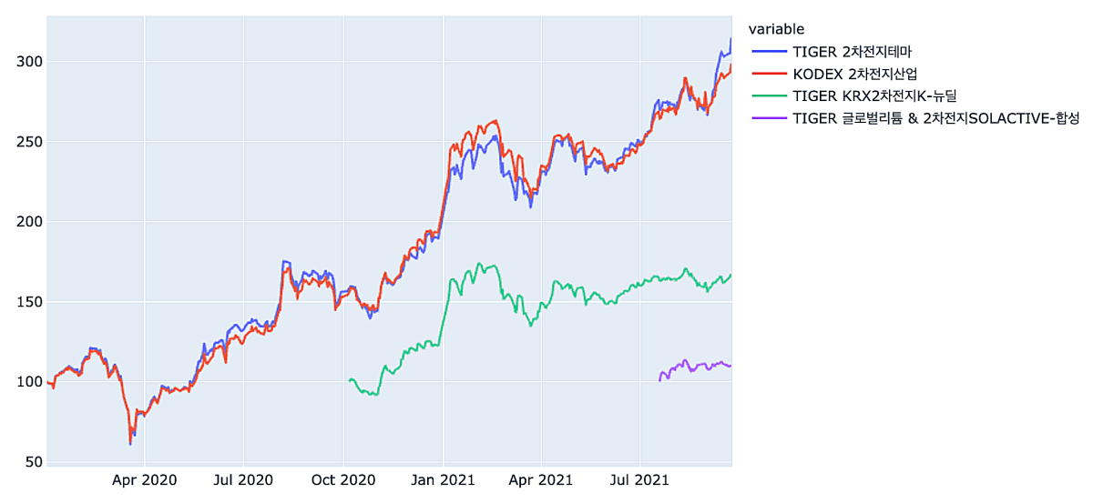 이 외에도 KODEX 2차전지산업(305720), TIGER KRX2차전지K-뉴딜(364980) , TIGER 글로벌리튬 & 2차전지SOLACTIVE-합성(394670) ETF 등이 있다. 이 ETF들과의 가격을 비교해보면 아래와 같다. 20년 1월 2일의 주가를 100으로 놓고, 이후 흐름을 비교해보았다.