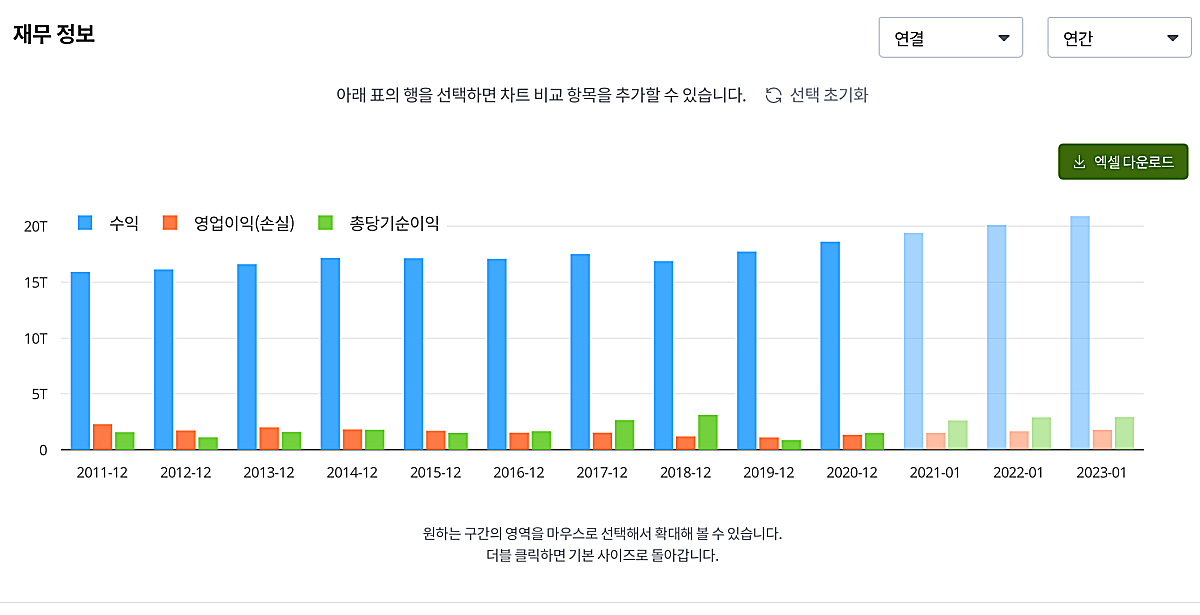 여기서 더 보기를 선택하면 약 10년 간의 재무정보를 확인할 수 있다. 이 때 데이터는 엑셀로도 다운로드가 가능하다. 필자는 프리미엄 서비스를 이용하는데, 엑셀 다운로드는 일반 회원은 안 될 수도 있다. 참고로 일반회원은 무료이고, 프리미엄은 비용이 발생한다.