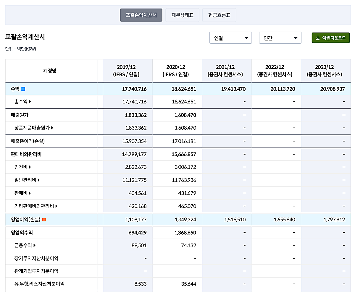 포괄손익계산서, 재무상태표, 현금흐름표도 세부 항목을 확인할 수 있다. 연간, 분기별로 다 확인이 가능하다.