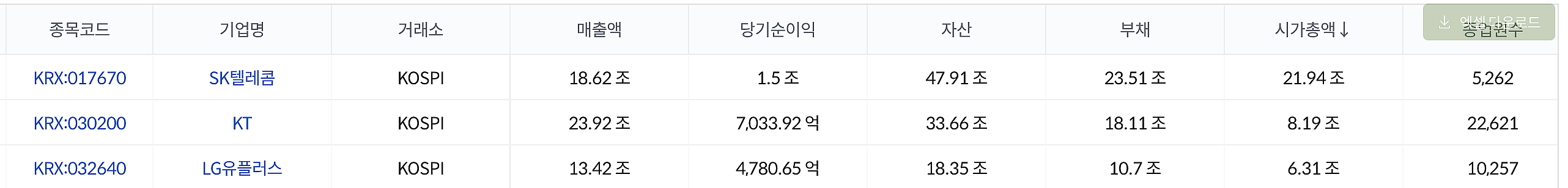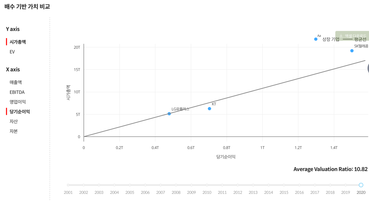 시가총액과 당기순이익을 비교해볼 수 있는데, SK텔레콤이 당기순이익 대비하여 주가가 조금 높은 상태였다.