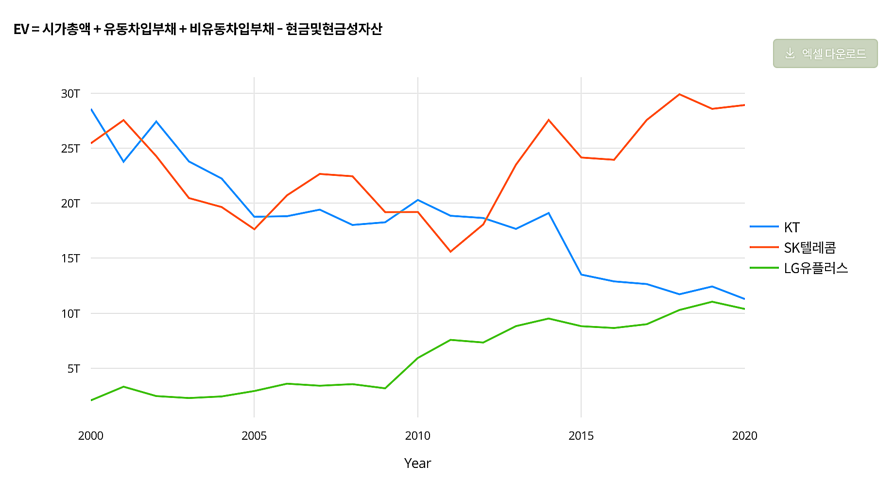 EV(Enterprise Value)도 시계열로 확인이 가능하다. 재밌는 것은 2010년에만 해도 SK텔레콤과 KT가 비슷했지만, 시간이 흐르면서 SK텔레콤은 넘사로 올라가고 KT와 LG유플러스가 비슷해졌다. EV에 대한 자세한 내용은 아래 포스팅을 참조하기 바란다.