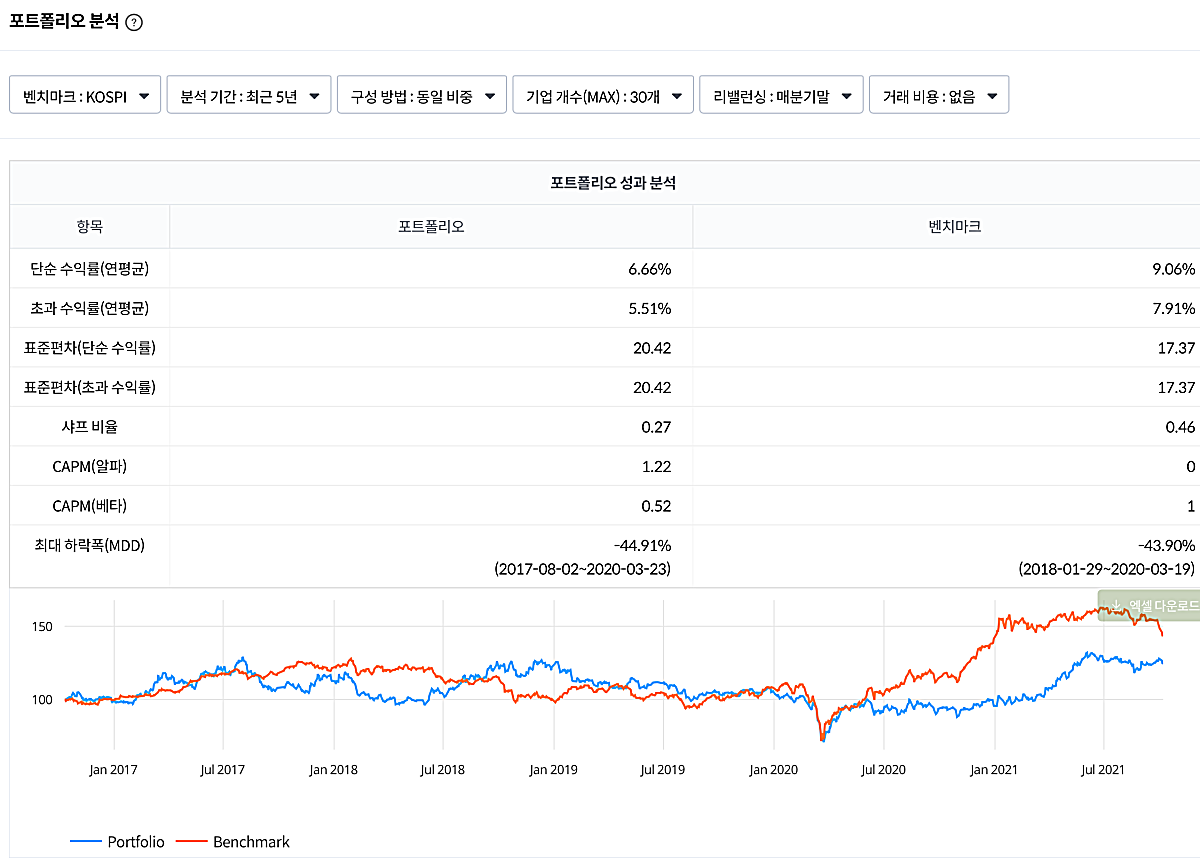 통신주 3개로 포트폴리오를 구성하면 어떻게 될까? 딥서치에서는 자동으로 포트폴리오를 구성해서, 코스피 30개 기업과 성과를 분석해준다. 통신주의 성격상 포트폴리오 성과는 좋지 않은 듯 하다.