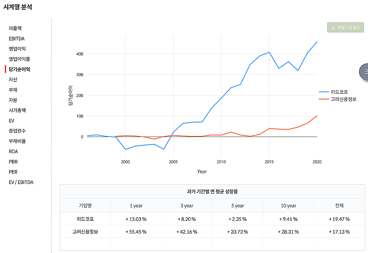 매출액, EVITDA, 영업이익, 영업이익률, 당기순이익, ROA, PBR, PER등의 수치도 쉽게 비교해 볼 수 있다. 그 중에 가장 인상적인 것은 당기순이익이었다. 리드코프가 당기 순이익 규모는 훨씬 크기 때문에 압도적으로 보인다. 하지만, 연평균 성장률을 비교해보면 고려신용정보의 당기순이익 성장률이 굉장히 높은 것을 알 수 있다.