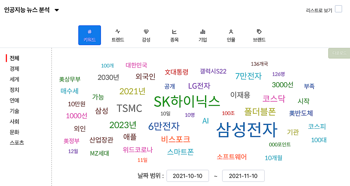 딥서치에서는 인공지능 뉴스 분석이라는 뉴스에서 자주 나오는 키워드를 추출해 보여주는 서비스도 운영하고 있다. 반도체 관련 산업에 대한 뉴스를 살펴보면 아래와 같다.