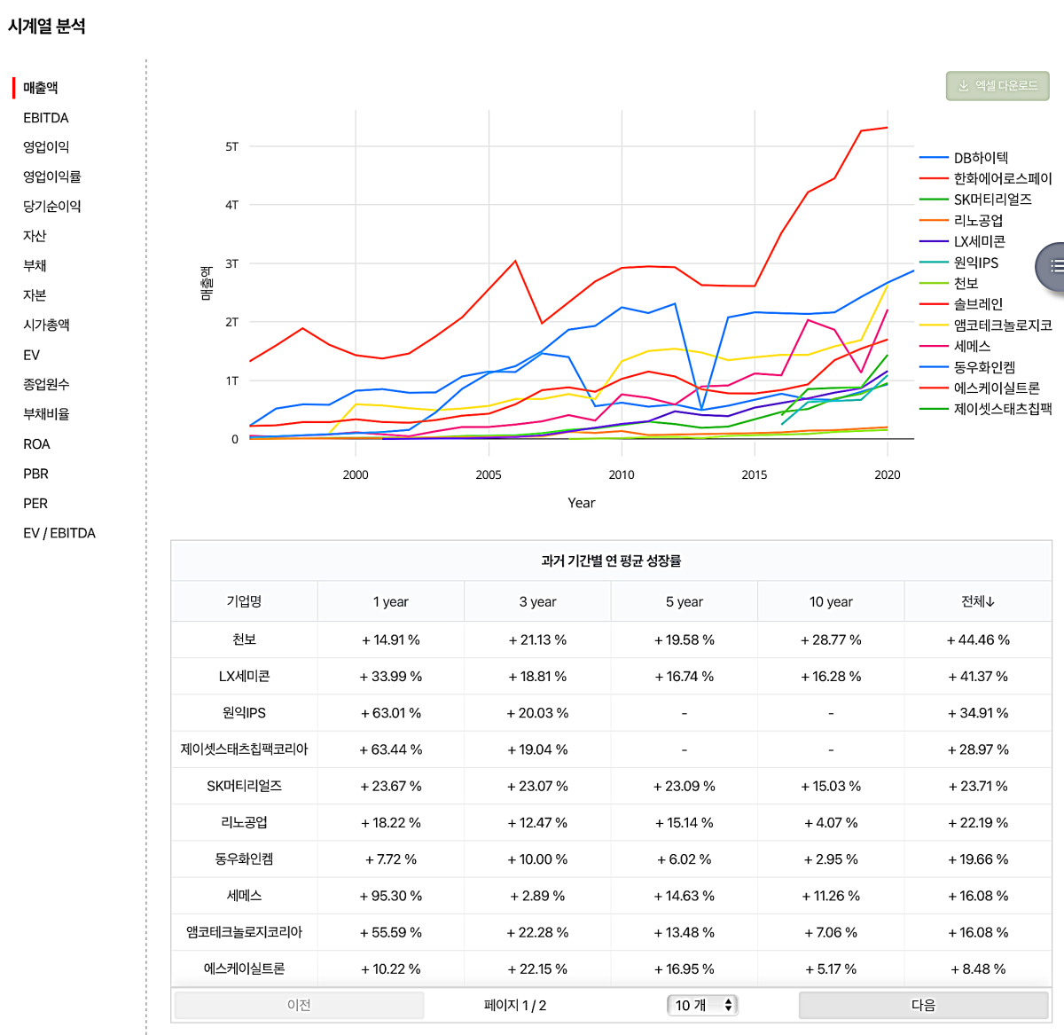 딥서치에서는 시계열 분석도 가능하다. 매출액 추이를 살펴보면 아래와 같다. 그래프상 가장 상단에 있는 주식은 한화에어로 스페이스이다. 삼성전자, SK하이닉스는 매출액 범위가 워낙 커서 그래프에서는 제외했다. 반도체는 최근에 활황이어서 그런지 매출액은 대부분의 기업이 증가하고 있는 추세이다.
