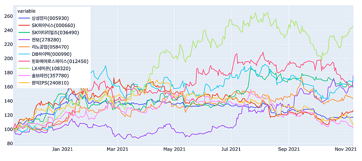 앞에서 언급한 10개 기업의 최근 1년간 주가를 비교해 보았다. 20년 11월 10일의 주가를 100으로 놓고, 이후 흐름을 비교해보았다.
