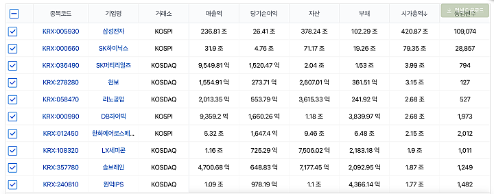 반도체에 속하는 기업을 코스피 19개, 코스닥 189개, 코넥스 8개, 비상장기업 583개가 선택되었다. 이들 중 대장주로 볼 수 있는 시가총액 기준 상위 10개 종목은 아래와 같다.