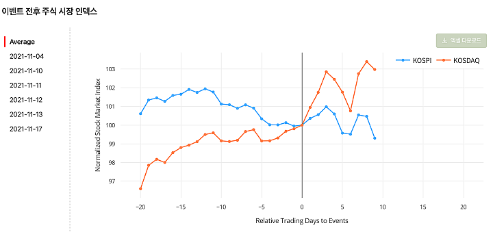 이벤트 전후 주식 시장 인덱스를 살펴보니, 코스닥이 코스피보다 더 많이 상승했다. NFT와 관련해서 게임주가 많이 속해있다보니 그런게 아닌가 싶다.