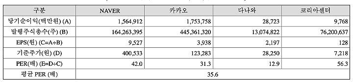 오토앤의 희망공모가 산정 방법은 아래와 같다. 우선 오토앤과 유사하다고 판단되는 기업들을 선정하고, 이들의 평균 PER을 구한다. 네이버, 카카오 유사기업으로 선정된 것은 좀 너무하지 않나싶다. 코리아센터는 전자상거래 관련 서비스를 제공하는 기업으로, 4개 기업 중에서 PER이 가장 높다.