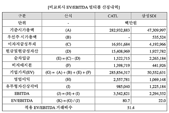 특이한 것은 위의 EV/EBITDA에서 조정을 한다. SK이노베이션으로부터 받은 라이선스 대가(9,922억), 일회선 비용인 ESS 리콜 충당금(4,269억), GM 볼트EV리콜 충당금(7,147억)원을 반영했다고 한다. 결론적으로는 EBITDA금액이 커져, 평가 시가총액이 더 커지는 효과가 나타났다.
