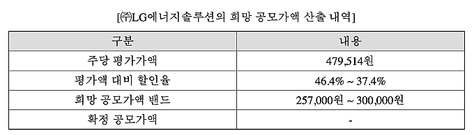 엘지 에너지 솔루션은 상장을 위해 21년 12월 7일 증권신고서를 제출했다. 희망공모가는 25.7~30만원이다. 공모규모는 약 12조, 예상 시가총액은 70조 정도 된다. 시장에서는 100조를 예상했는데 그보다는 보수적으로 책정됐다.