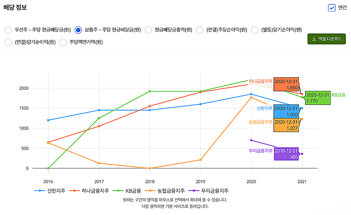 배당정보도 비교해볼 수 있다. 2020년에는 모든 은행주가 배당액이 줄어든 것을 알 수 있다. 21년에는 이보다 더 줄어들지 않을까 싶다.