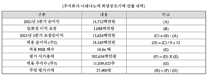 희망공모가는 보통 유사기업들의 평균 가치를 확인한 후에, 이를 해당 기업에 적용하여 계산된다. 나래나노텍도 이와 같은 방법으로 희망공모가가 산정되었다. 아바코, 비아트론, 에스엔유가 유사기업으로 선정되었고, 이들의 평균 PER인 16.6을 기준으로 희망공모가가 산정되었다.