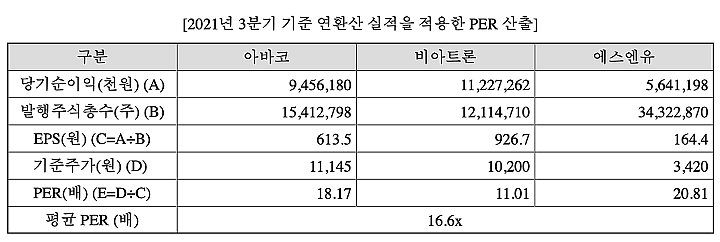 21년 3분기 순이익을 기준으로 일회성 이익을 조정하고, 년으로 환산하여 주당 평가가액을 구했다. 주당 평가가액은 27,400원이다.