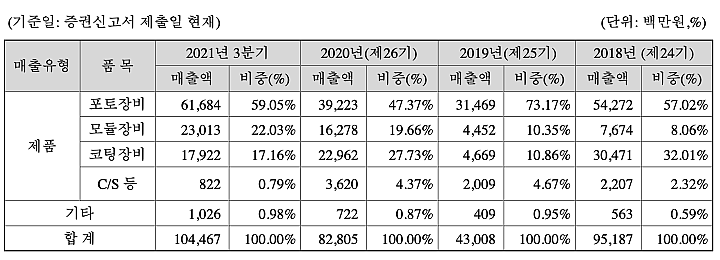 21년에 포토장비, 모듈장비의 매출이 크게 늘어난 것을 확인할 수 있다.