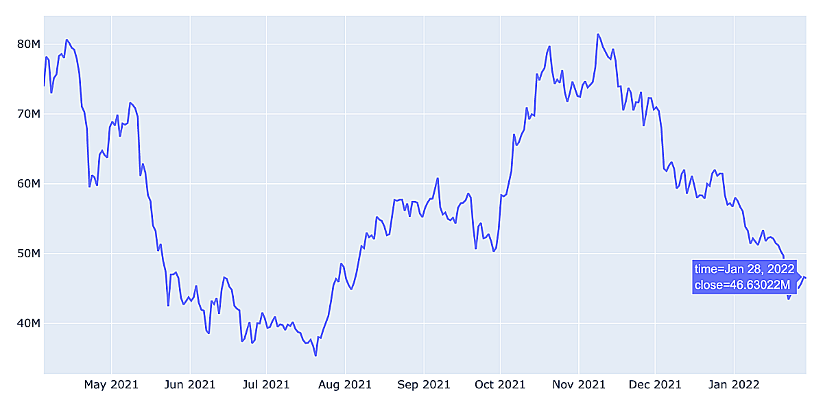 비트코인 최근 300일간 거래기록을 그래프로 그려보았다. 21년 8월부터 가격을 회복하다가 최근에 테이퍼링, 금리인상, 양적긴축 등의 이슈로 가격이 크게 하락한 것을 알 수 있다.