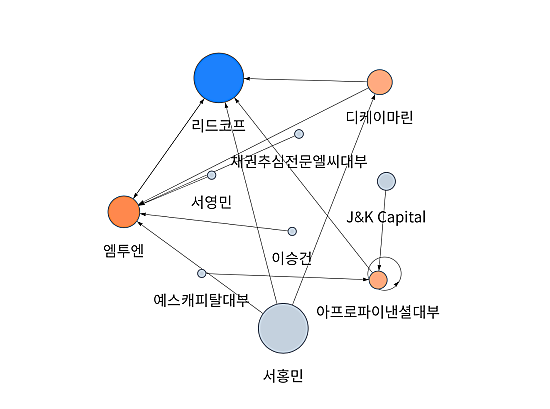 엠투엔은 한화그룹 회장 처남이 서홍민 회장이 경영하고 있다. 서 회장은 디케이마린, 엠투엔, 리드코프의 지분을 보유하고 있다. 그래서 리드코프는 엠투엔의 관계사이다.