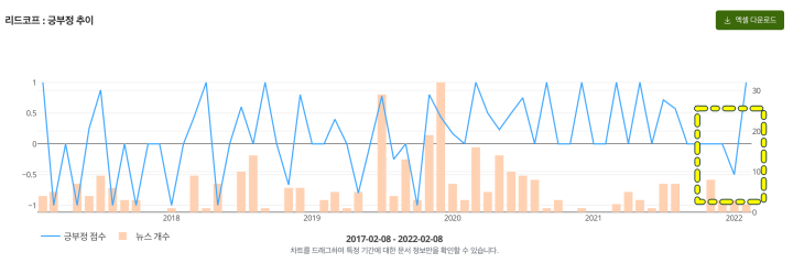 뉴스를 확인해 봤다. 딥서치에서는 기업 관련 뉴스의 긍부정 점수를 매겨서 보여준다. 1월 점수가 굉장히 낮은 것을 알 수 있다.