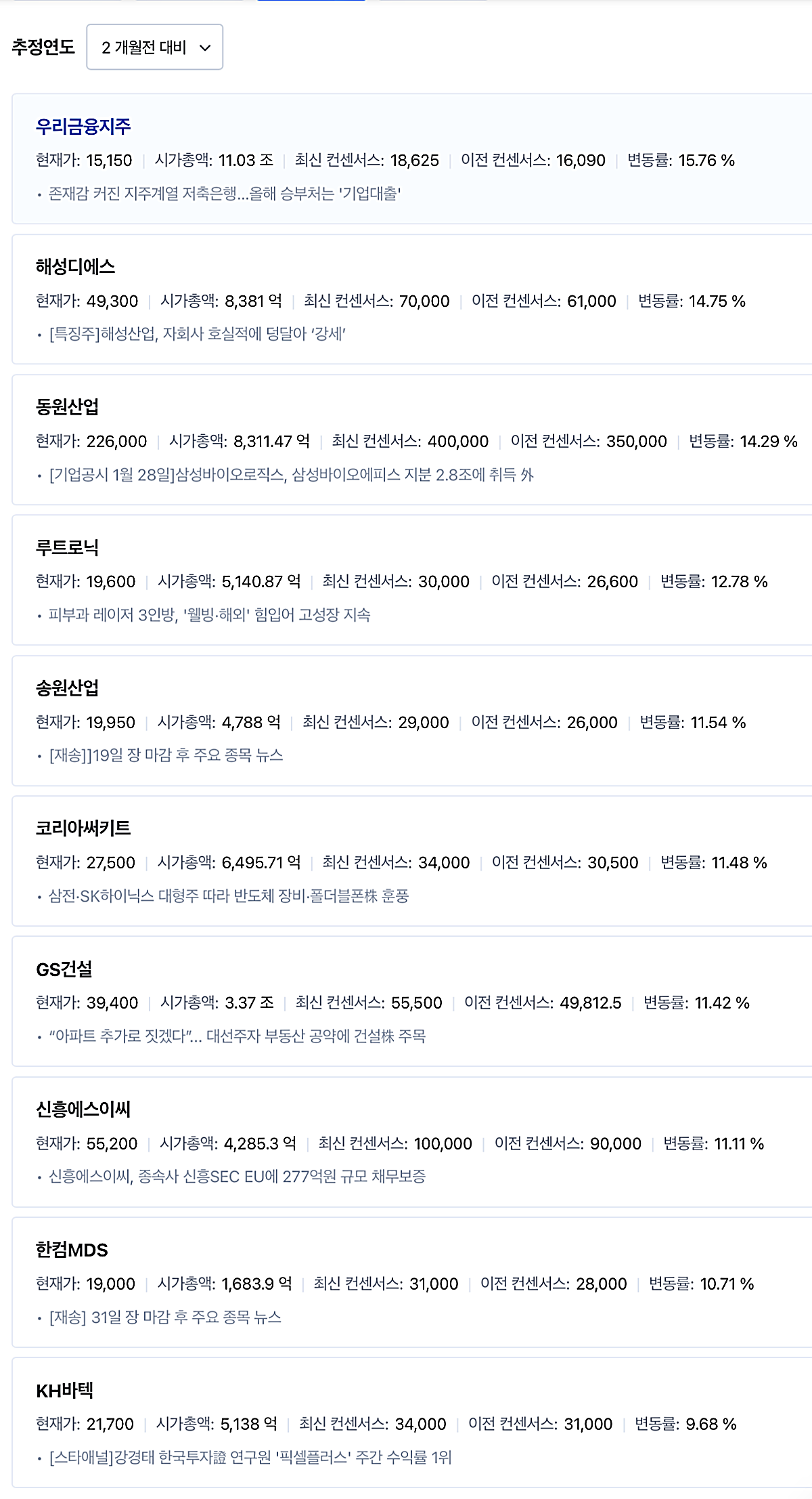 증권사에는 컨센서스를 발표합니다. 컨센서스란 전문가들이 분석을 통해 내놓는 시장과 업종, 주식에 대한 투자 정보입니다. 증권사에서는 특정 종목의 목표주가도 발표합니다. 현재 기준으로 목표주가 상향 주식은 어떤 종목이 있는지 알아보았습니다. 끝으로 확인하는 방법도 다루었으니 참고하시기 바랍니다.