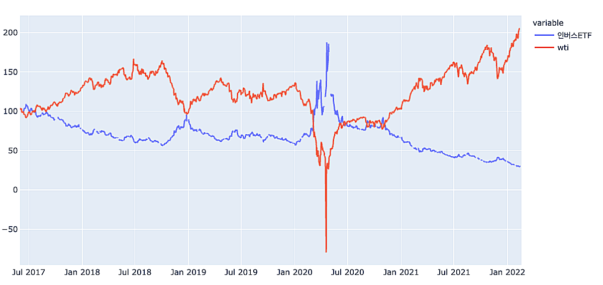 확실히 방향이 반대인 것은 눈에 띈다. 하지만 자세히 보면 인버스ETF의 변동이 훨씬 적다. 일간 수익률 추종을 목표로 하기 때문에, 변동이 더 적어지는 것이 아닌가 싶다. 최초 가격을 100으로 놨을 때, 2022년 2월 20일 기준 WTI숫자는 205.8이다. 하지만 인버스ETF의 숫자는 30.07이다. 변동은 적지만 최근에 계속해서 하락세를 겪으면서 가격은 많이 하락했다.