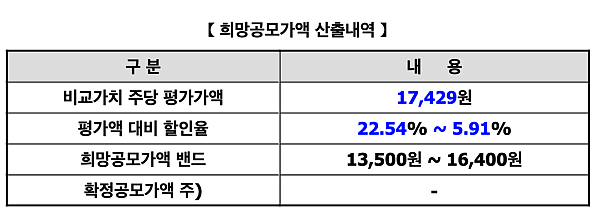 할인율 5.91~22.54%을 적용하면, 희망공모가 13,500~16,400원이 나온다. 할인율은 2021년 코스닥 상장법인 평가액 대비 할인율 평균이라고 한다.