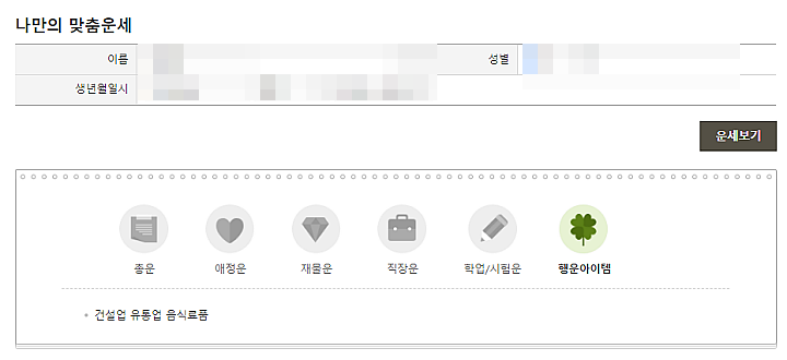 오늘의 운세에서 가장 재밌는 내용은 행운아이템이다. 주식과 관련이 있는 업종이 나오기 때문이다. 필자는 건설업, 유통업, 음식료품이 나왔다. 관련 업종의 주식을 사는 건, 글쎄 비추다. 그냥 재미로 보는 게 좋겠다.