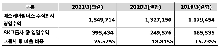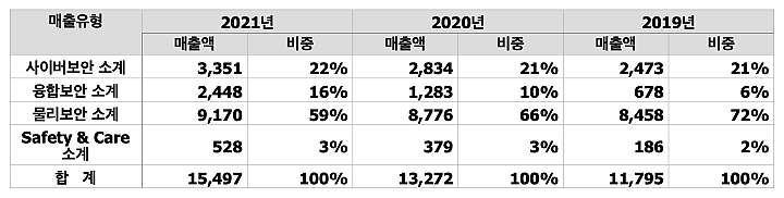 이 중 융합보안 플랫폼 기반 서비스의 매출이 가장 크다. 21년에 증가한 융합보안사업의 매출액은 그룹사 매출이 증가한 영향이 크다. SK 그룹사이기 때문에, 그룹사의 매출 비중이 높다.