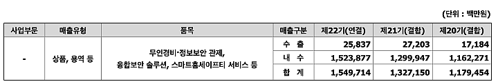 매출액은 계속 성장하고 있으며, 내수의 성장폭이 눈에 띈다. 무인경비·정보보안 관제, 융합보안 솔루션, 스마트홈세이프티 서비스 등이 주요 품목이다.