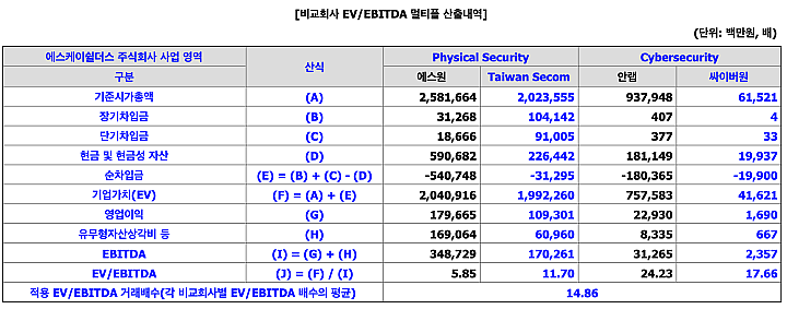희망공모가는 유사기업과 비교를 통해 나온다. SK쉘더스는 에스원, Taiwon SECOM, 안랩, 싸이버원의 4개 회사가 유사기업으로 선정됐다. 보통은 PER을 많이 이용하는데, SK쉘더스는 위 기업의 평균 EV/EBITDA를 이용해서, 주당 가치를 산정했다.