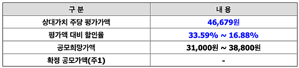 여기에 평가액 대비 할인율 16.88% ~ 33.59%를 적용하면, 희망공모가 31,000 ~ 38,000원이 나온다.