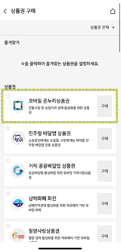 그럼 아래와 같이 제일 상단에 모바일 온누리 상품권을 확인할 수 있습니다. 선택해서 구매하시면 됩니다.