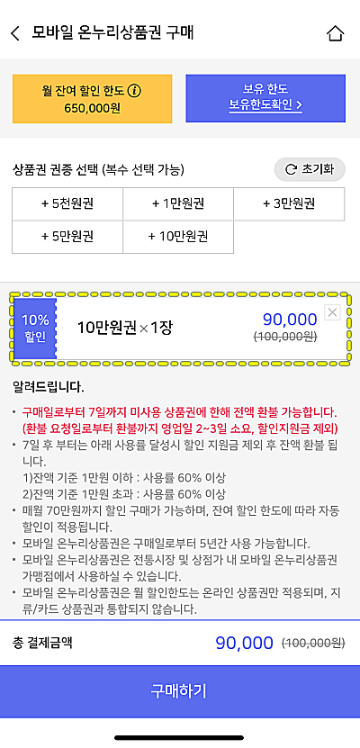 모바일 온누리 상품권은 구매할 때 10%가 할인됩니다. 살 때부터 할인되니 편리합니다.