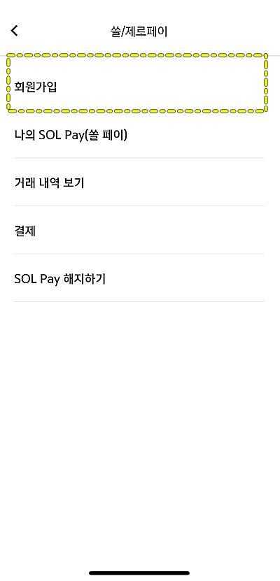 '쏠/제로페이'는 별도의 회원가입이 필요합니다. 회원가입을 하지 않았다면, 아래 화면의 상단의 회원가입 메뉴로 들어갑니다. 회원가입이 돼 있다면 '이미 회원가입이 되어 있습니다.'라는 메시지가 나옵니다.