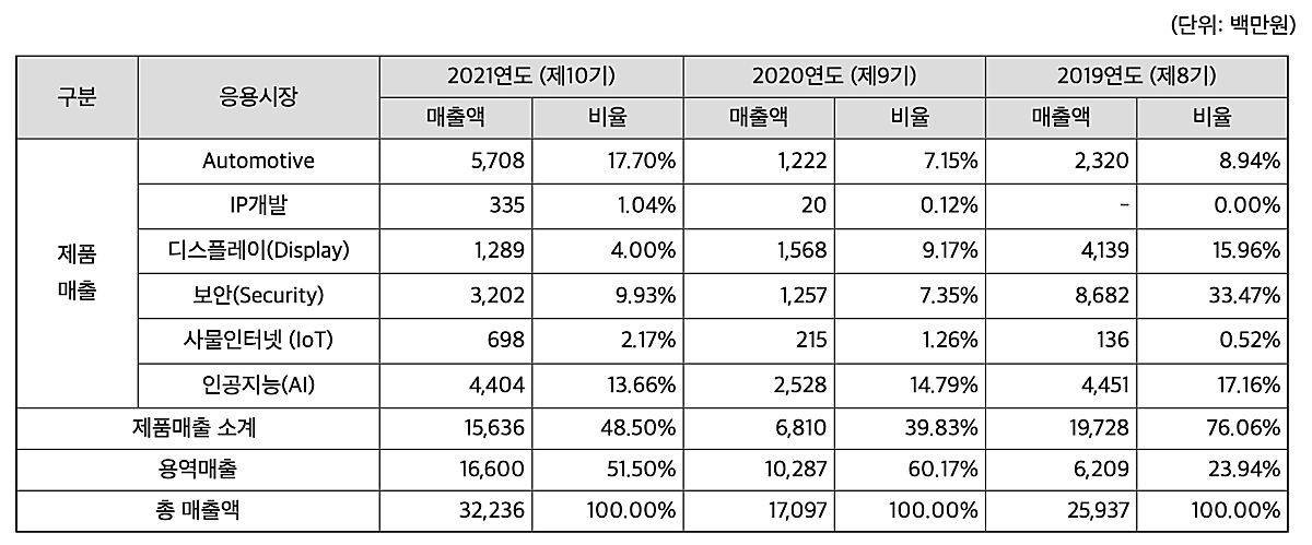 제품 적용분야를 기준으로 크게 차량용, 인공지능(AI), 보안용, 디스플레이용, 사물인터넷용(IOT) 5가지로 나눌 수 있다. 매출액을 살펴보면 차량용과 IOT는 증가하고, 다른 분야는 감소하는 것을 알 수 있다.
