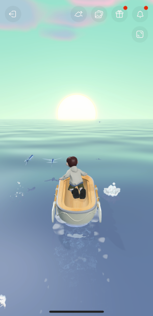 플로팅은 홈화면에서 바다에 뭔가가 표류하는 모양의 아이콘을 선택하면 되는데요. 음악과 함께 떠내려가는 아바타가 배를 타고 떠나는 모습을 볼 수 있습니다. 특별히 할 것은 없고 이렇게 다니다보면 럭키 아이템을 얻을 수도 있습니다. 우측 상단의 알림 아이콘을 선택하면 여러 가지 메시지를 볼 수 있는데요. '럭키 아이템을 획득하였습니다!' 라는 메시지가 오면 얻은 것입니다.