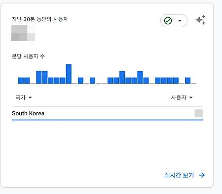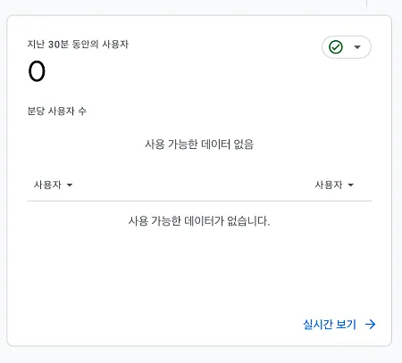 연결이 제대로 되었는지 확인하려면, GA홈에서 우측에 있는 지난 30분 동안의 사용자를 확인하는 것이 좋습니다. 내 PC에서 티스토리에 접속하거나, 스마트폰에서 접속해 보세요. 그 후에도 해당 카드에 1이 표시되지 않는다면 연결이 제대로 되지 않은 것입니다.