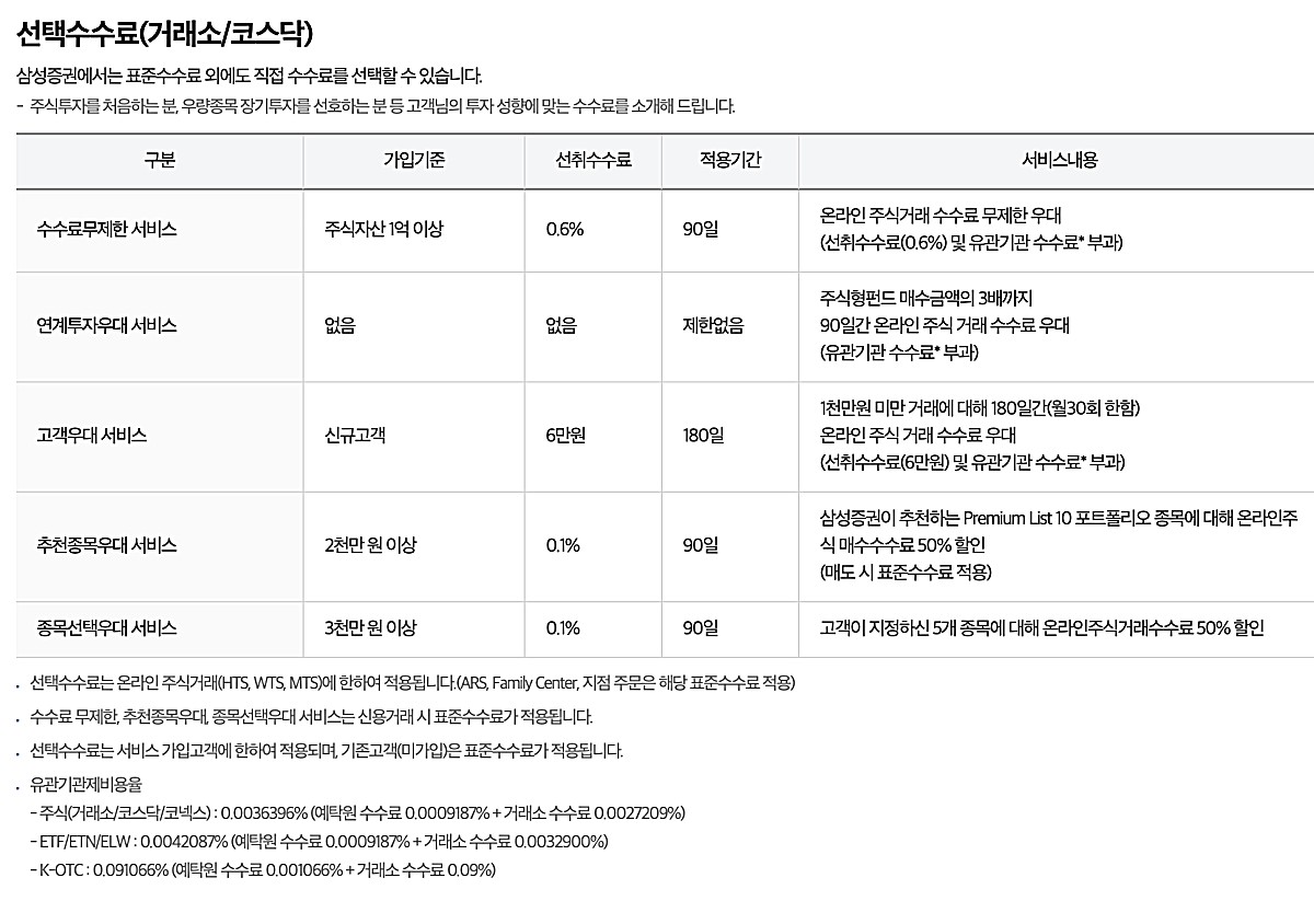 삼성증권의 온라인, 오프라인 수수료는 비싼 편이다. 그래서인지 몰라도 선택수수료라는 옵션을 제공하고 있다. 특정 상품에 가입하면 그에 따라 수수료를 감면해주는 서비스이다. 요즘은 주식매매수수료를 무료로 제공하는 경우가 많아, 메리트가 없는 수수료 체계이긴 하다.