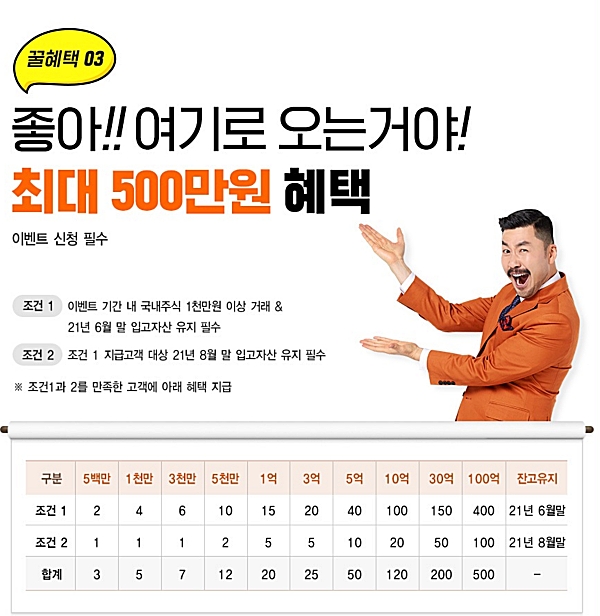 한화투자증권도 비대면 계좌개설 이벤트를 진행하고 있다. 신규고객과 휴면고객을 대상으로 거래수수료 평생무료 혜택과 투자지원금 지급, 주식이관 프로모션, 신용융자와 담보대출 금리 혜택 이벤트를 하고 있다. 기간은 21년 5월 31일까지이다. 증권사 중에서는 후발주자에 속해서인지 이벤트는 가장 혜택이 많은 듯 하다.