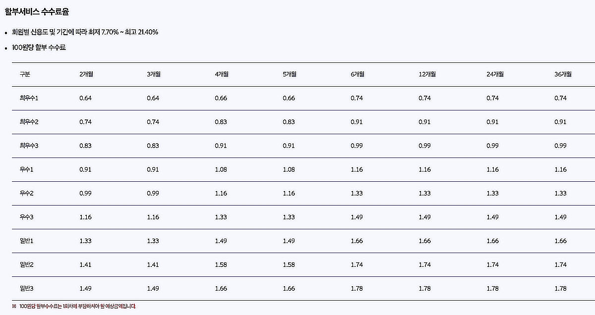 100원당 할부수수료를 알 수 있다. 최저 0.64원 ~ 최고 1.78원까지이다. 년이율로 계산해보기 위해서 12개월을 곱해서 100원으로 나눠주면, 7.68% ~ 21.36%정도 나온다. 하지만 할부수수료율의 범위가 넓어서 크게 의미가 없다. 자신에게 해당하는 할부수수료율을 알아야 한다.