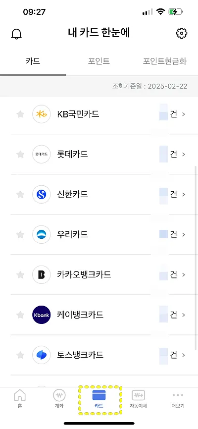 먼저, 앱을 설치하고 로그인 합니다. 그리고 하단에 '카드' 탭을 선택하면, 아래와 같이 보유한 카드를 한 번에 조회할 수 있습니다.